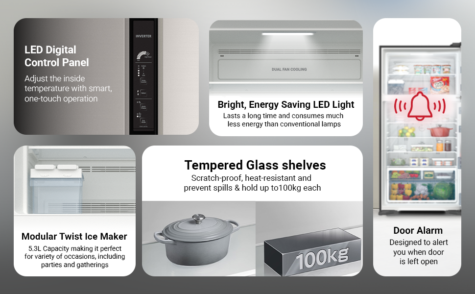| مميزات خاصة | انفرتر – تحكم الكتروني – الوضع الاقتصادي – التجميد السريع – إنذار فتح الباب – قفل الأطفال – غطاء مروحة الفريزر مع عاكس تبريد مزدوج المروحة ومستشعر حراري صديق للبيئة ونانو تيتانيوم |