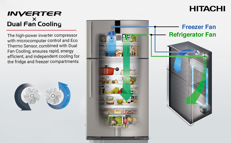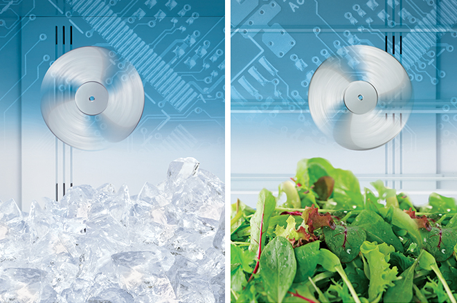 يعمل هذا النظام على تبريد حجيرات المجمد والثلاجة بشكل مستقل، وهو أمر لا يمكن لمروحة واحدة القيام به. وباستخدام مروحتين، يتم تدوير الهواء البارد الذي يولده العاكس القوي بسرعة وكفاءة كبيرتين.