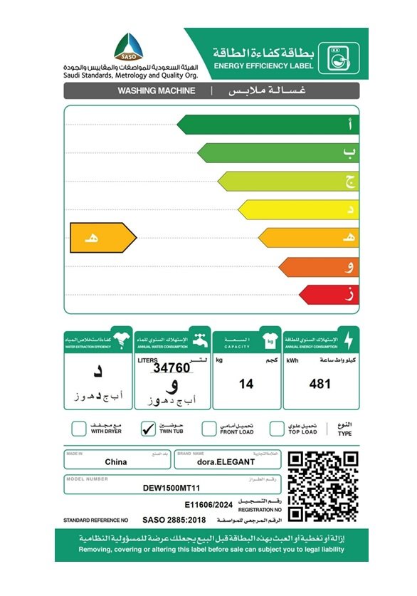 🧼 غسالة دورا اليجانت حوضين 14 كجم – أبيض – DEW1500MT11